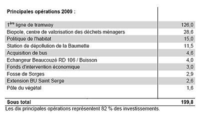 Sans surprise, la construction de la première ligne de tramway représente le principal poste d'investissement (voir ci-dessous la liste des principales opérations) et la plus grosse part de l'endettement.