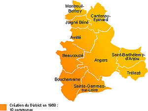 En 1968, 10 communes angevines dont Angers, créent, le District urbain. (Beaucouzé, Montreuil-Belfroy, Juigné-Béné, Cantenay-Epinard, Avrillé, Bouchemaine, Sainte-Gemmes-sur-Loire, Saint-Barthélemy-d'Anjou et Trélazé)