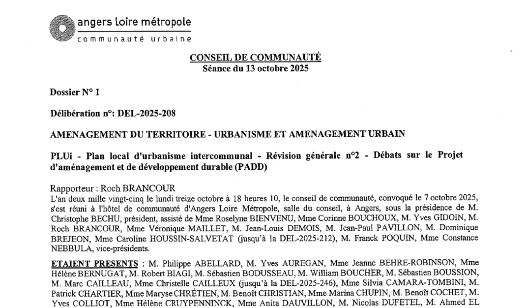 Le PADD a fait l'objet d'un débat en conseil communautaire d'Angers Loire Métropole le 13 octobre 2025.